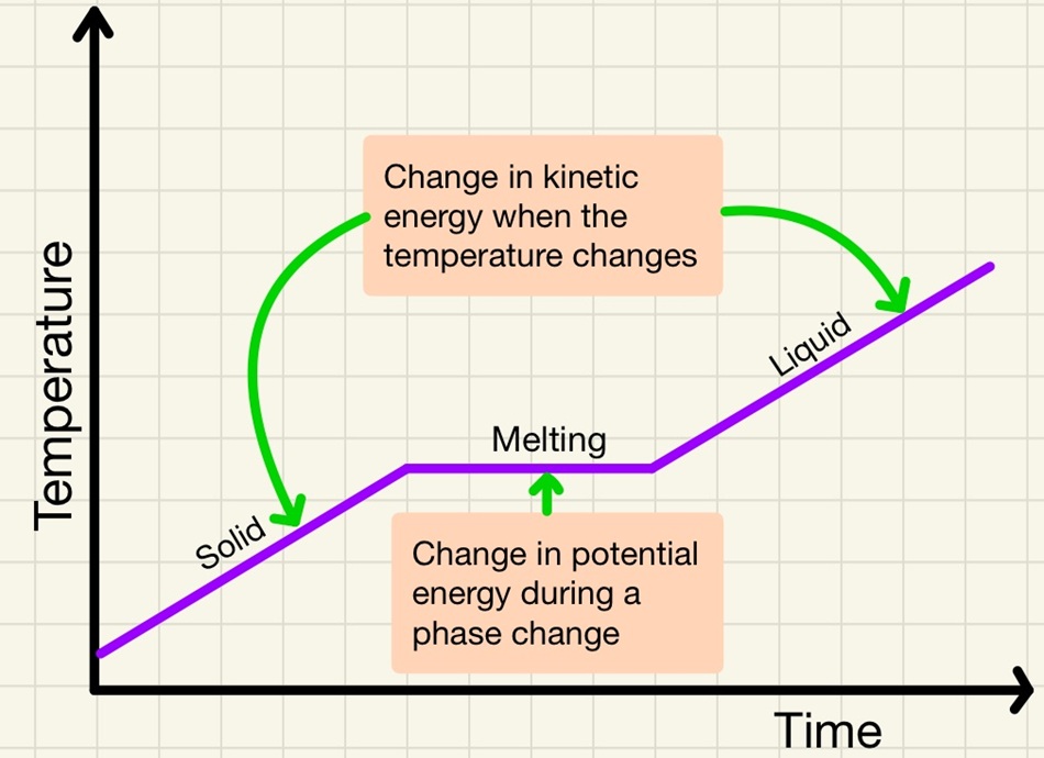 This is a fascinating topic that we can see in real life every winter. Scientist Joseph Black observed that the temperature of a block of ice will keep rising until it reaches the melting point, although it is still absorbing heat energy, it stays at 0°C until it is completely melted then the temperature will begin to rise again. This is because of latent heat. When a substance warms, it is absorbing heat energy and it is all transferred to the kinetic store of the internal energy. When it reaches a phase change, it will continue to absorb heat energy but this is transferred to the potential store as bonds/attractions are overcome. During the phase change, there is no increase in kinetic energy so there is no increase in measurable temperature.