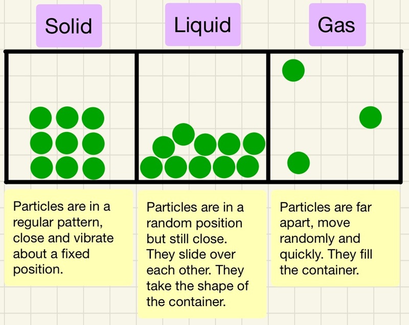 Liquid: particles are mostly touching but are sliding over each other and not in any regular arrangement. These particles flow to the sides of the container, the container determines the shape.
